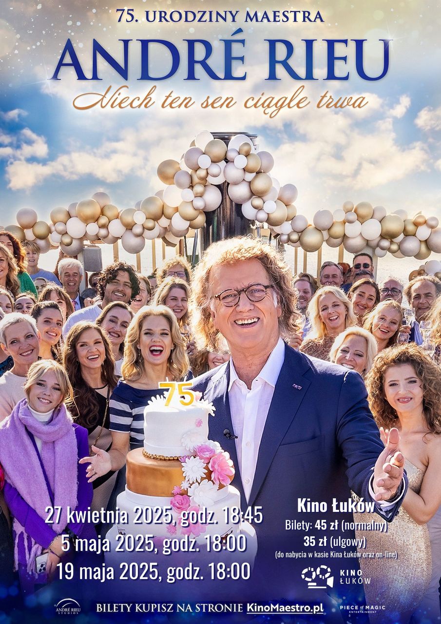 „André Rieu. Niech ten sen ciągle trwa” jest to retransmisja koncertu produkcji holenderskiej z 2025 roku. Będzie to Jubileuszowy koncert z okazji 75. urodzin Maestra. André Rieu niedawno skończył 75 lat i z tej okazji zaprasza Cię do świętowania swoich urodzin. Wydarzenie odbyło się na pięknym statku, którym – razem ze swoją ukochaną Orkiestrą Johanna Straussa – pływał w październiku ubiegłego roku po rzece Mozie w rodzinnym mieście króla walca - Maastricht. Tak wszyscy świętowali jego jubileusz, bowiem Maestro urodził się dokładnie 1 października 1949 roku. W kinie i na pokładzie tego statku czeka więc na Ciebie wielkie urodzinowe przyjęcie i wiele przepięknej muzyki! Nasz nowy kinowy show jest wyrazem uznania dla młodzieńczych snów i marzeń André o założeniu własnej orkiestry i podróżowaniu z nią po całym świecie. To wybór utworów z ulubionych tras koncertowych Maestra. Większość z tych koncertów nigdy wcześniej nie była pokazywana na dużym ekranie, zatem to Twoja szansa, aby zobaczyć kultowe klasyki André Rieu po raz pierwszy. To wielkie święto, wejdź więc na pokład tej rozmuzykowanej łodzi i dołącz do Maestra i jego znakomitych gości! W trakcie koncertu dowiesz się też, jakie plany na przyszłość ma nasz ukochany król walca.