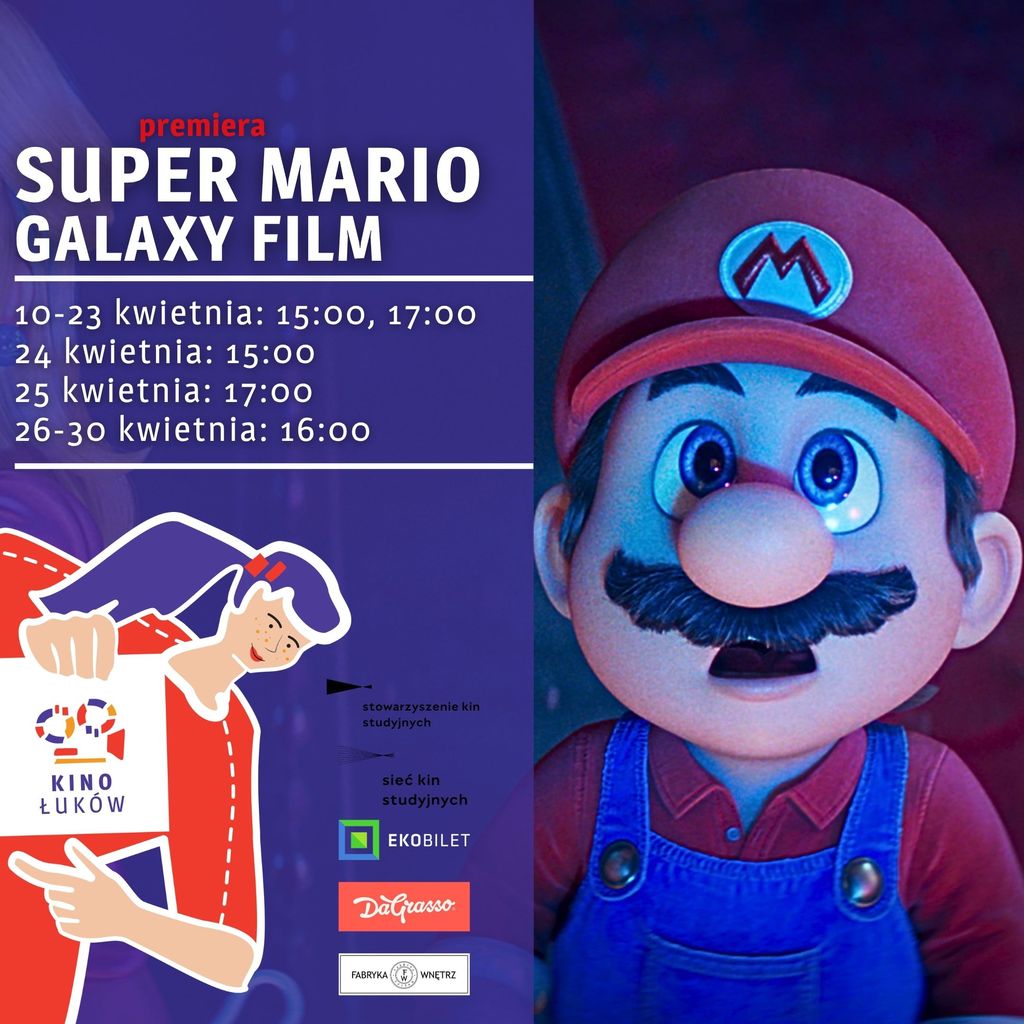„Super Mario Galaxy Film” w dniach od 10 do 16 kwietnia o godz. 15:00 oraz 17:00. Czas: 1 godz. 38 minut.