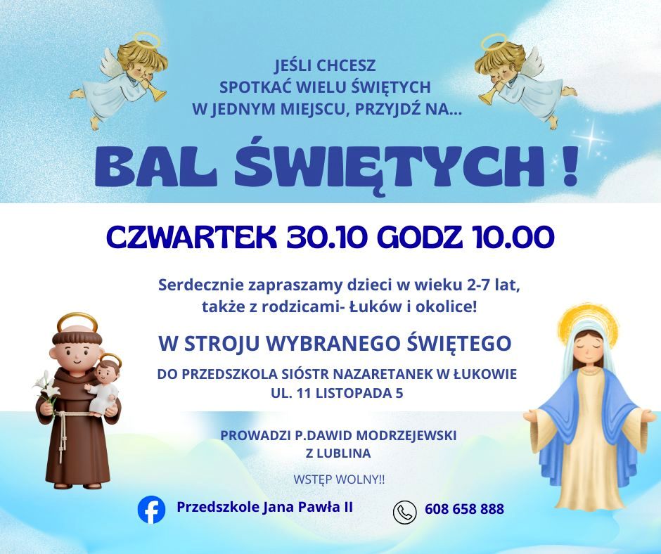 Bal Świętych będzie idealną okazją, aby przebrać się w stroje wybranych świętych i wspólnie bawić się w duchu radości, zabawy oraz wiary. Poprowadzi go Dawid Modrzejewski z Lublina. Wstęp jest wolny, a Siostry Nazaretanki zachęcają do udziału w nim dzieci z Łukowa i okolic. Więcej informacji można znaleźć na stronie Przedszkola Jana Pawła II lub pod numerem telefonu 608 658 888.Bal Świętych w Przedszkolu im. Jana Pawła II w Łukowie, nie tylko dla przedszkolaków, już w czwartek, 30 października. Początek zabawy godzina 10:00.