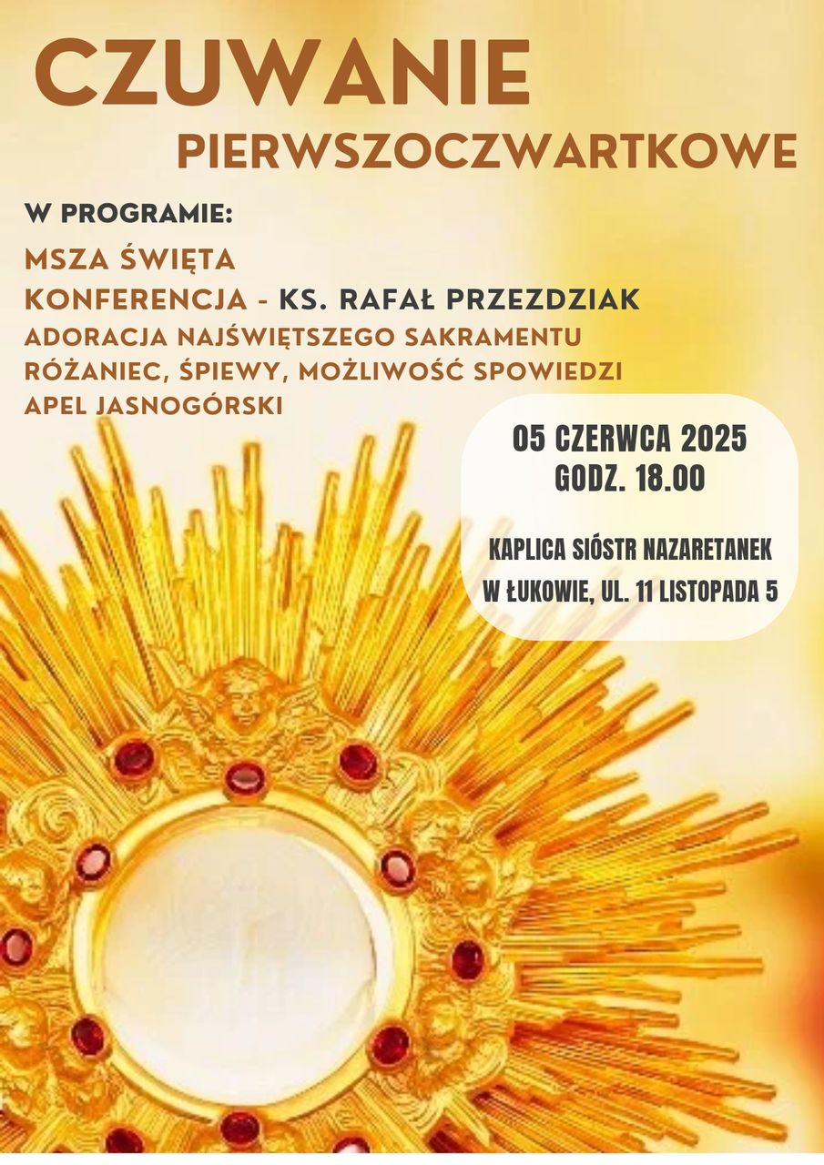 Do wspólnej modlitwy w czwartek, 5 czerwca, zapraszają siostry ze Zgromadzenia Najświętszej Rodziny z Nazaretu oraz grupa uwielbienia. Najważniejszym punktem wieczoru będzie Msza Święta, po której ksiądz Rafał Przeździak wygłosi konferencję na temat odpustów związanych z Rokiem Jubileuszowym oraz 150. rocznicą powstania Zgromadzenia Sióstr Nazaretanek.W dalszej części spotkania odbędzie się adoracja Najświętszego Sakramentu połączona z modlitwą różańcową i śpiewem. Będzie również możliwość skorzystania z sakramentu pokuty i pojednania. Całość zakończy Apel Jasnogórski.