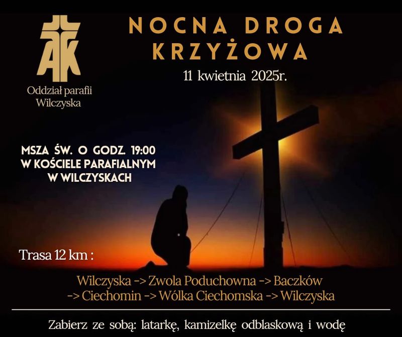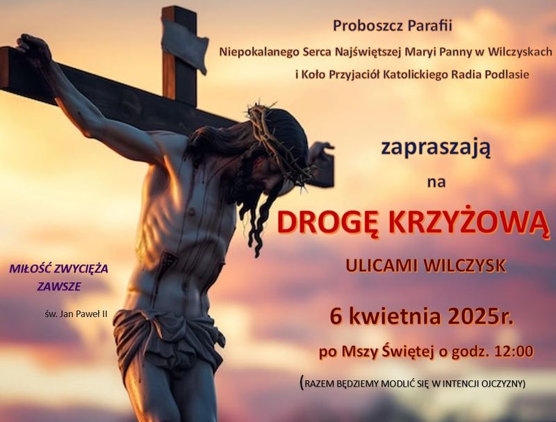 Po raz trzeci w parafii Niepokalanego Serca Najświętszej Maryi Panny w Wilczyskach organizowane będą dwie Drogi Krzyżowe. Pierwsza z nich odbędzie się 5 kwietnia po Mszy Świętej o godz. 12:00 ulicami Wilczysk, na zakończenie rekolekcji wielkopostnych. W tej pątniczej drodze wierni modlić się będą w intencji Ojczyzny. Natomiast 11 kwietnia po Mszy Świętej o godzinie 19:00 odbędzie się Nocna Droga Krzyżowa. Trasa, którą będą mieli do pokonania pątnicy, będzie liczyła 12 kilometrów – informuje Katarzyna Iwaniec.Do udziału w Nabożeństwach Drogi Krzyżowej zapraszają księża z parafii Niepokalanego Serca Najświętszej Maryi Panny w Wilczyskach, Koło Przyjaciół Katolickiego Radia Podlasie oraz Akcja Katolicka.