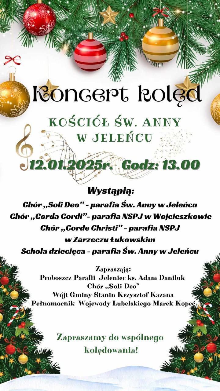 Koncert kolęd w kościele Świętej Anny w Jeleńcu odbędzie się w najbliższą niedzielę, 12 stycznia. Rozpocznie się o godzinie 13.00. Zaprezentują się na nim chóry „Corda Cordi” z Wojcieszkowa i „Corde Christi” z Zarzecza Łukowskiego. Wystąpią też gospodarze wydarzenia, czyli chór „Soli Deo” i schola dziecięca.