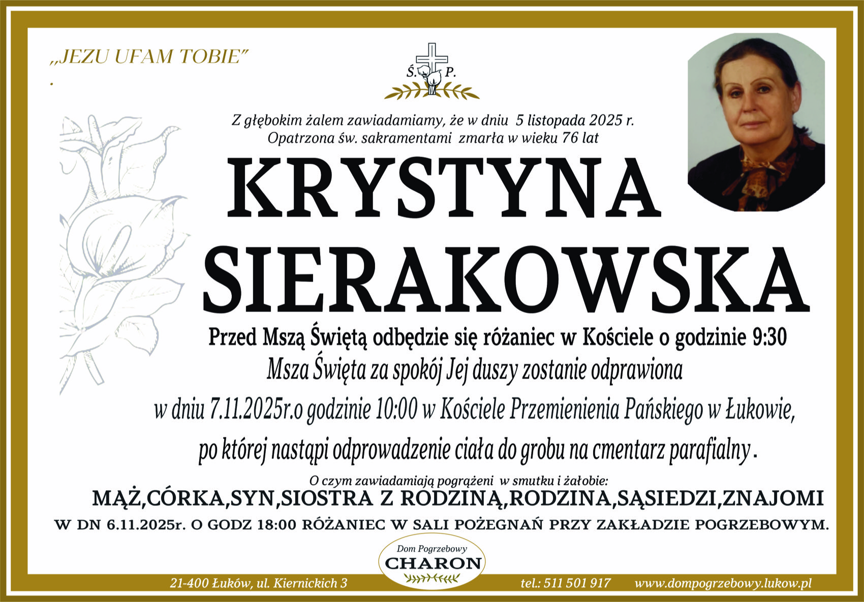 Msza Święta pogrzebowa zostanie odprawiona 7 listopada o godz. 10:00 w Kościele Przemienienia Pańskiego w Łukowie. Po Eucharystii nastąpi złożenie ciała do grobu na cmentarzu parafialnym.Różaniec w intencji śp. Krystyny Sierakowskiej odbędzie się 6 listopada o godz. 18:00 w Sali Pożegnań przy Zakładzie Pogrzebowym Charon oraz przed Mszą Świętą w kościele o godz. 9:30.