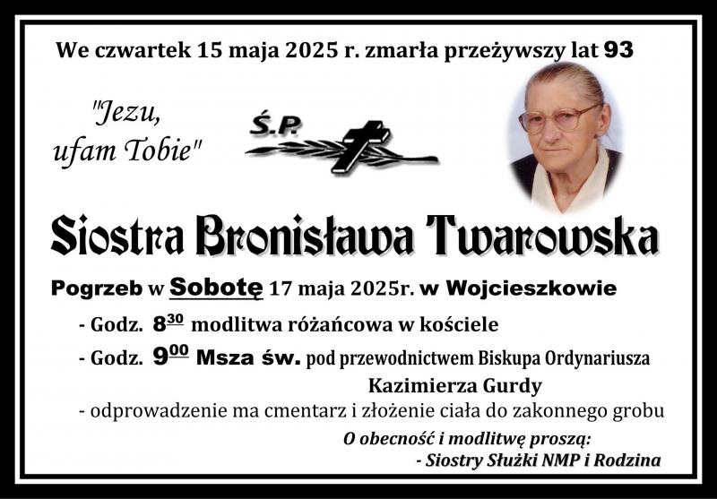 Siostra Bronisława Twarowska ze Zgromadzenia Sióstr Służek Najświętszej Maryi Panny Niepokalanej zmarła w czwartek, 15 maja. Miała 93 lata. Pożegnanie siostry Bronisławy odbędzie się w sobotę, 17 maja w kościele Najświętszego Serca Pana Jezusa w Wojcieszkowie. O godzinie 8.30 odbędzie się modlitwa różańcowa, a o godzinie 9.00 Msza Święta pogrzebowa. Eucharystii będzie przewodniczył ksiądz biskup Kazimierz Gurda.