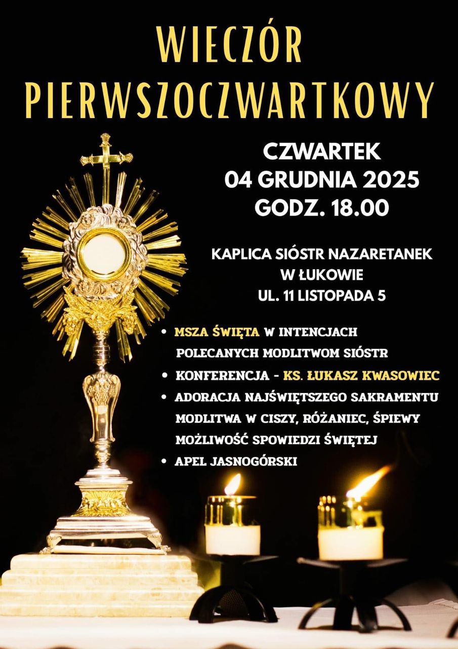 Pierwszoczwartkowe czuwanie, które odbędzie się 4 grudnia, rozpocznie Msza Święta o godzinie 18:00. Po Eucharystii konferencję wygłosi ks. Łukasz Kwasowiec, diecezjalny duszpasterz służby liturgicznej. Następnie odbędzie się adoracja Najświętszego Sakramentu, różaniec i śpiewy. Będzie też możliwość przystąpienia do spowiedzi świętej.Tradycyjnie pierwszoczwartkowe czuwanie w kaplicy Sióstr Nazaretanek zakończy się Apelem Jasnogórskim.