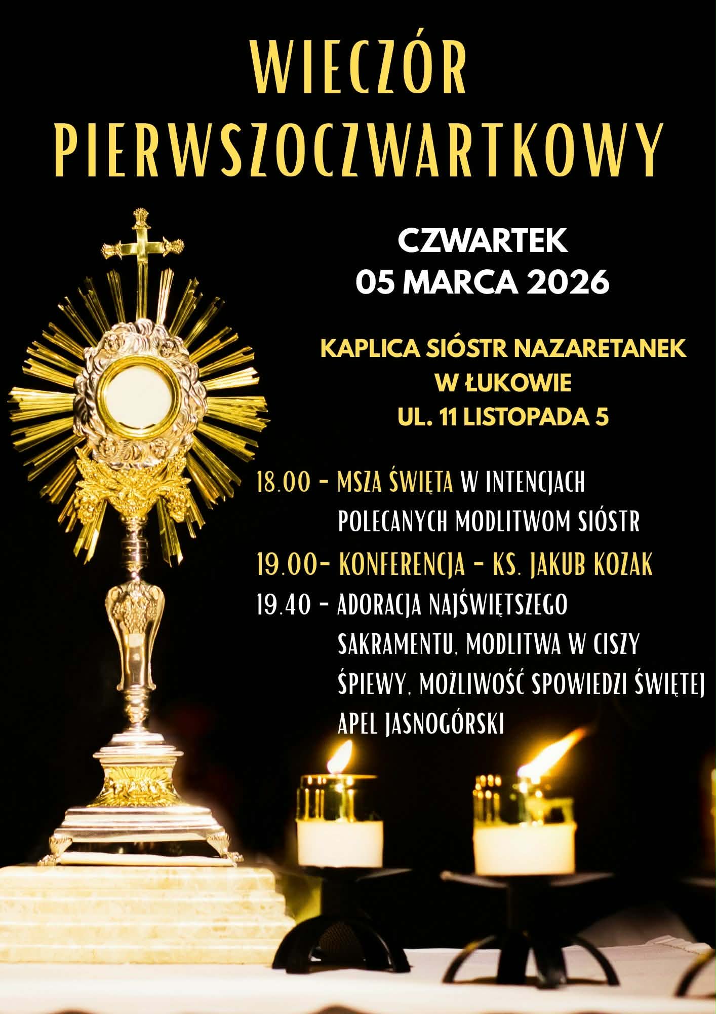 Pierwszoczwartkowy Wieczór, który już 5 marca, rozpocznie Msza Święta o godzinie 18:00. Po Eucharystii konferencję wygłosi ks. Jakub Kozak, dyrektor Wydziału Duszpasterstwa Rodzin Diecezji Siedleckiej. Następnie odbędzie się adoracja Najświętszego Sakramentu, różaniec i śpiewy. Będzie też możliwość przystąpienia do spowiedzi świętej.Tradycyjnie Pierwszoczwartkowe modlitewne spotkanie zakończy się Apelem Jasnogórskim.