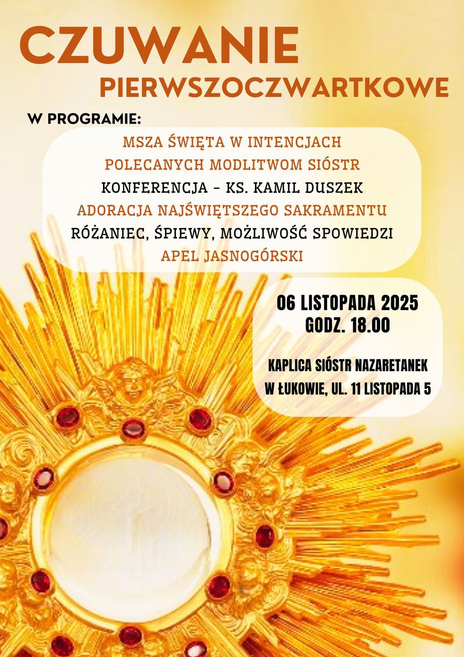 W kaplicy Sióstr Nazaretanek w Łukowie odbędzie się Pierwszoczwartkowe Czuwanie. Początek modlitewnego spotkania, które już 6 listopada, godzina 18:00.
