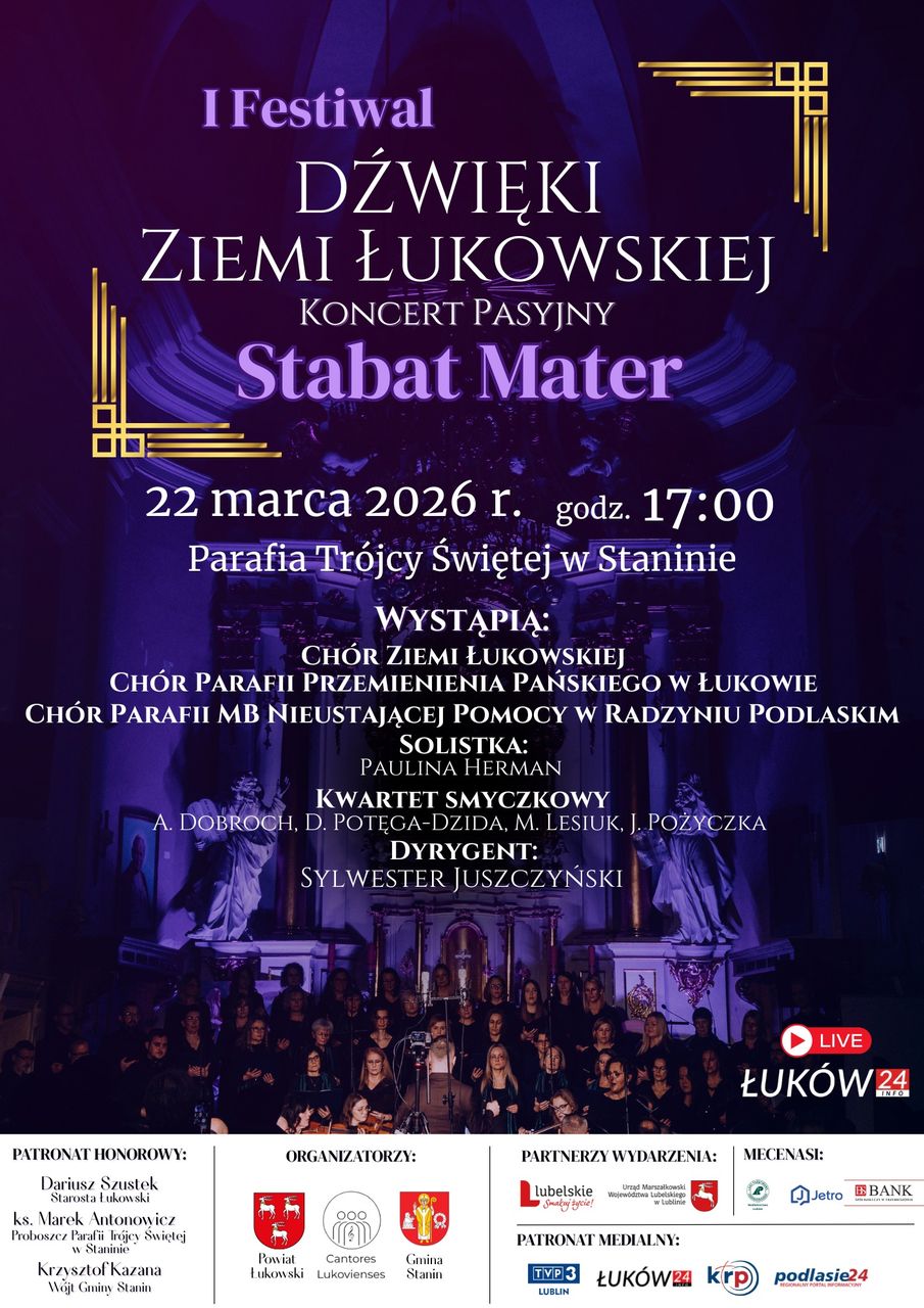 Organizatorami I Festiwalu „Dźwięki Ziemi Łukowskiej”, w ramach którego w kościele Świętej Trójce w Staninie odbędzie się Koncert Pasyjny „Stabat Mater”, organizują powiat łukowski, gmina Stanin oraz Stowarzyszenie Cantores Lukovienses. Partnerem wydarzenia jest Urząd Marszałkowski w Lublinie.Przed publicznością wystąpią Chór Ziemi Łukowskiej, chór parafii Przemienienia Pańskiego w Łukowie oraz chór parafii Matki Boskiej Nieustającej Pomocy w Radzyniu Podlaskim. Towarzyszyć im będzie kwartet smyczkowy w składzie Amelia Dobroch, Dominika Potęga-Dzida, Maria Lesiuk i Jakub Pożyczka oraz solistka Paulina Herman. Dyrygować będzie Sylwester Juszczyński.