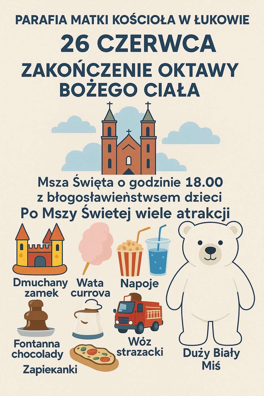 Msza Święta z procesją i błogosławieństwem dla dzieci, a następnie piknik pełen niespodzianek – tak w parafii NMP Matki Kościoła w Łukowie zakończą się obchody Oktawy Bożego Ciała.
