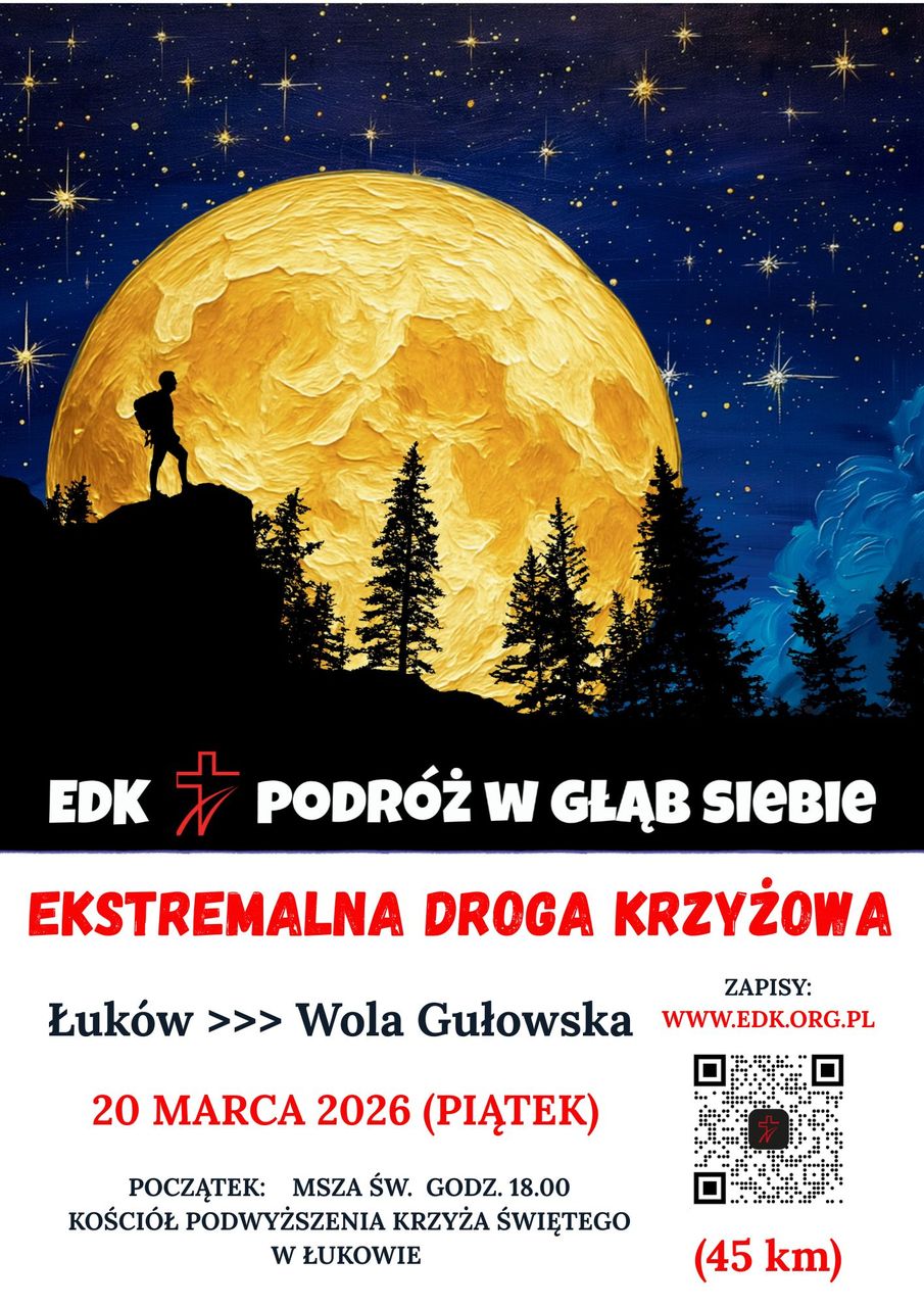 Ekstremalna Droga Krzyżowa to 45 km nocą, w skupieniu. Samotnie lub w małej grupie. Jednak to nie pokonywanie kilometrów, ale podróż w głąb siebie. To duchowe wyzwanie, które będzie można podjąć zapisując się na organizowaną już po raz drugi przez Łukasza Bieńczaka Ekstremalną Drogę Krzyżową z parafii Podwyższenia Krzyża Świętego do Sanktuarium w Woli Gułowskiej. Rozpocznie się ona w piątek, 20 marca Mszą Święta o godzinie 18:00 w łukowskiej świątyni. Po Eucharystii każdy indywidualnie wyruszy w trasę.Do udziału w Ekstremalnej Drodze Krzyżowej wciąż zaprasza jej organizator, Łukasz Bieńczak: