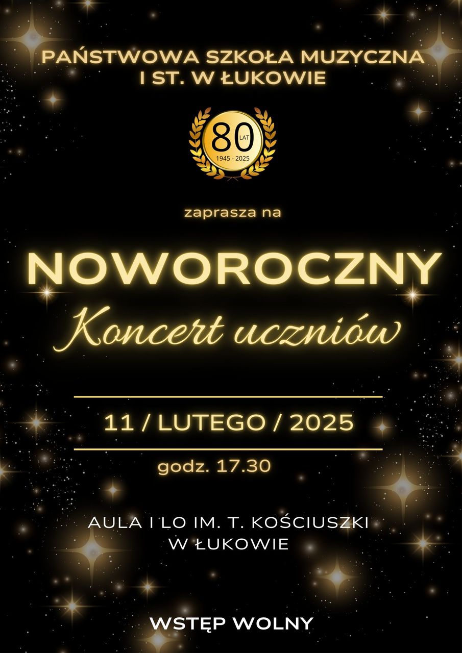 Noworoczny Koncert w wykonaniu uczniów łukowskiej szkoły muzycznej odbędzie się 11 lutego. Rozpocznie się o godzinie 17.30. Miejsce, gdzie wystąpią młodzi muzycy będzie aula I LO im. T. Kościuszki w Łukowie. Wstęp wolny.Koncert będzie podsumowanie pierwszego półrocza nauki. Wystąpią na nim wyróżniający się soliści, grupy rytmiczne oraz chór i orkiestra dęta. Koncert potrwa około 75 minut.