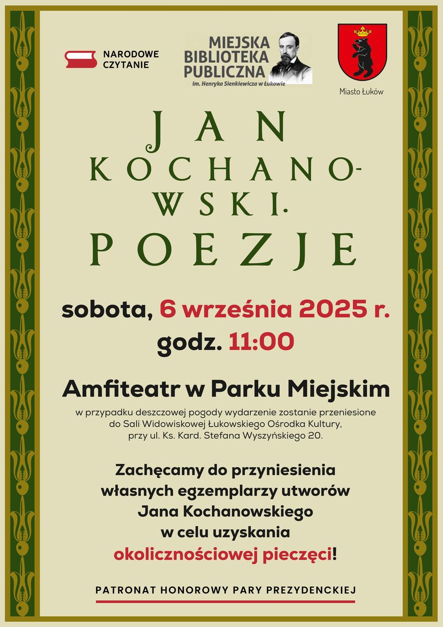Miejska Biblioteka Publiczna im. Henryka Sienkiewicza w Łukowie po raz kolejny organizuje spotkanie z wielką literaturą polską. Odbędzie się ono w ramach Narodowego Czytania, któremu patronuje Para Prezydencka. Tym razem wszyscy czytać będziemy poezję Jana Kochanowskiego.Jeśli dopisze pogoda wspólne czytanie odbędzie się w amfiteatrze w parku miejskim. W razie opadów gościnę zapewni Łukowski Ośrodek Kultury. W gronie czytających będą samorządowcy, czytelnicy, bibliotekarze i uczniowie łukowskich szkół.