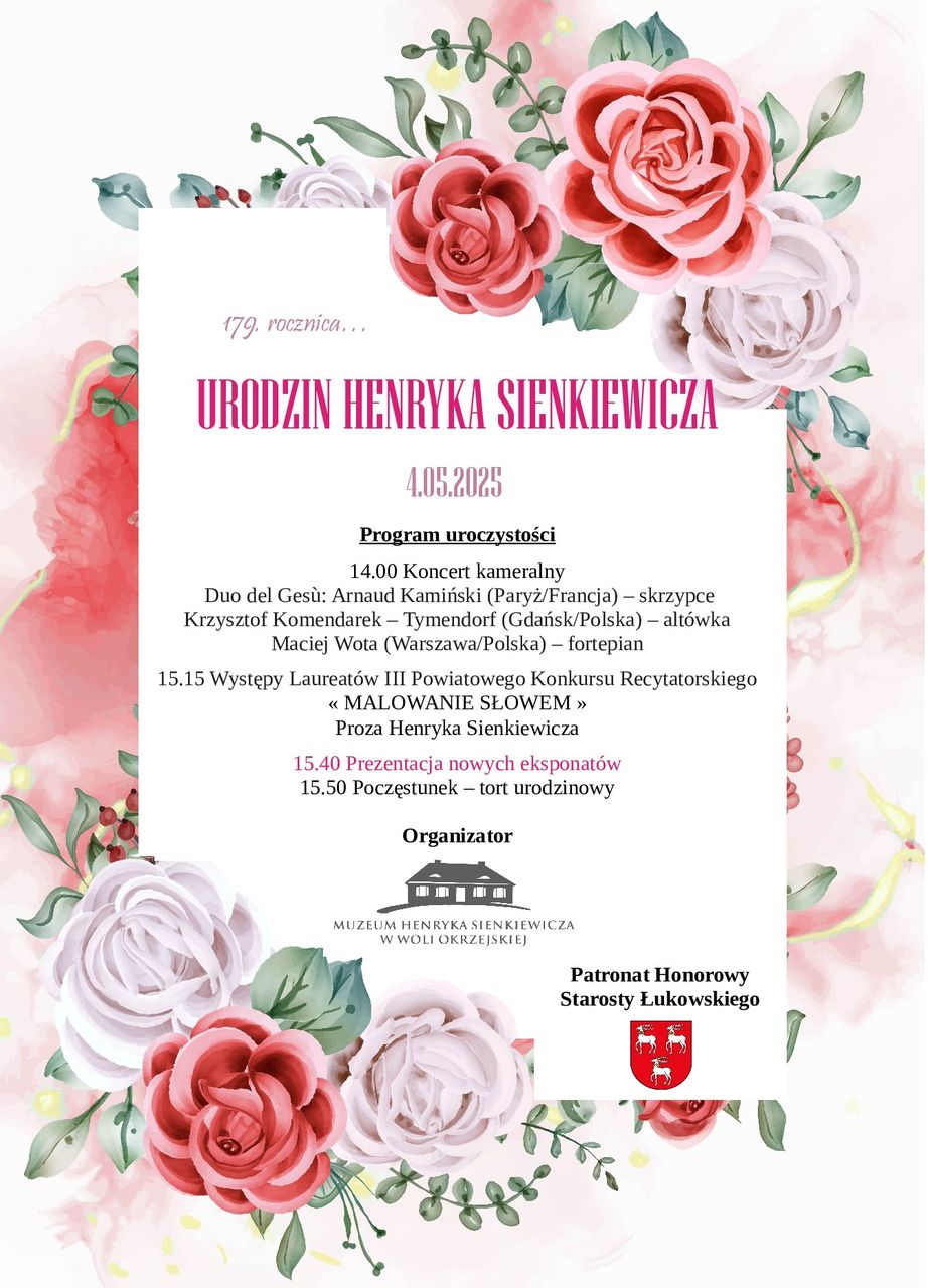 W niedzielę, 4 maja, świętować będziemy 179. rocznicę urodzin Henryka Sienkiewicza. Z tej okazji w miejscu urodzenia noblisty – w Woli Okrzejskiej – odbędzie się wyjątkowe urodzinowe przyjęcie. W programie przewidziano koncert oraz występy laureatów konkursu recytatorskiego „Malowanie Słowem”.