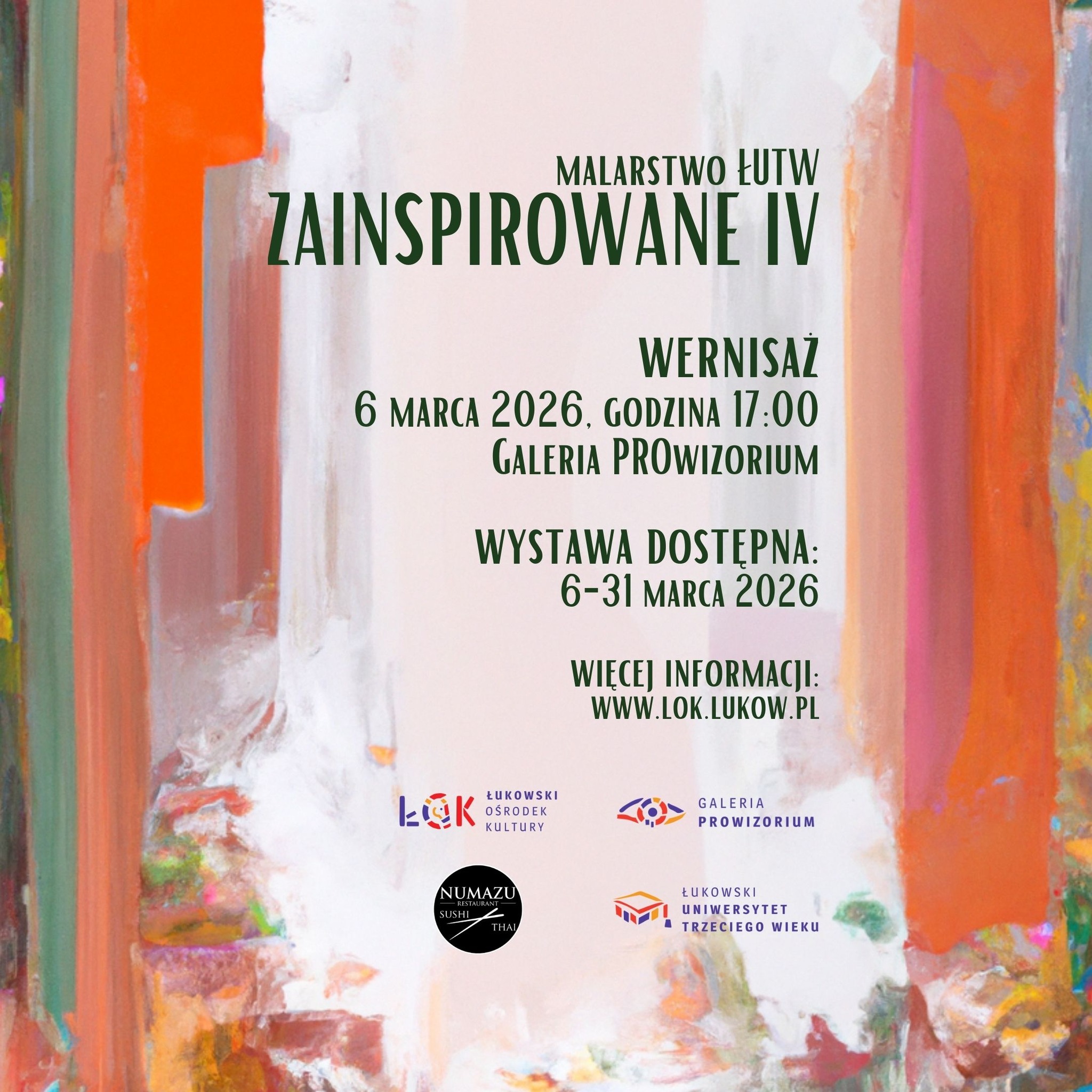 Wystawa, której wernisaż odbędzie się w piątek, 6 marca w Galerii PROwizorium Łukowskiego Ośrodka Kultury nosi tytuł „Zainspirowane IV”. To kolejna bowiem edycja wystawy, na której będzie można zobaczyć prace słuchaczek Łukowskiego Uniwersytetu Trzeciego Wieku. Prace powstały podczas zajęć prowadzonych przez Annę Karolkiewicz i Ewelinę Szałkiewicz.Wernisaż wystawy „Zainspirowane IV” już w piątek, 6 marca. Początek godzina 17:00.
