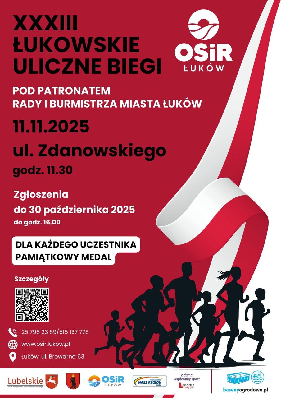Po części oficjalnej, o godzinie 11.30 rozpoczną się XXXIII Łukowskie Uliczne Biegi Niepodległości. Start i meta będą znajdować się na ulicy Zdanowskiego. Organizatorem jest Ośrodek Sportu i Rekreacji, a patronują im burmistrz i Rada Miasta.