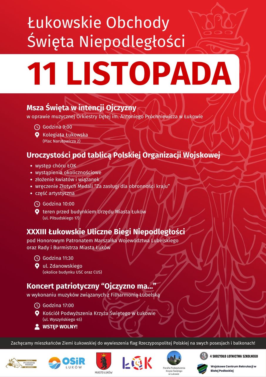 Obchody 107. rocznicy odzyskania przez Polskę niepodległości rozpoczną się w Łukowie Mszą Świętą w intencji Ojczyzny, która sprawowana będzie w kościele Przemienienia Pańskiego. Eucharystia rozpocznie się o godzinie 9.00. Następie wszyscy spotkają się przed tablicą Polskiej Organizacji Wojskowej, umieszczoną na froncie budynku Urzędu Miasta i Starostwa Powiatowego.