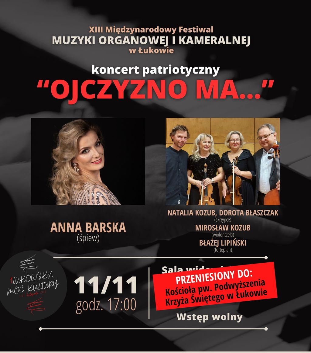 Dzień zakończy koncert „Ojczyzno ma...”. Odbędzie się on w kościele Podwyższenia Krzyża Świętego. Rozpocznie o godzinie 17:00. Wystąpią muzycy związani z Filharmonią Lubelską: Anna Barska – sopran, Dorota Błaszczak – skrzypce, Natalia Kozub – skrzypce, Błażej Lipiński – fortepian oraz Mirosław Kozub – wiolonczela.