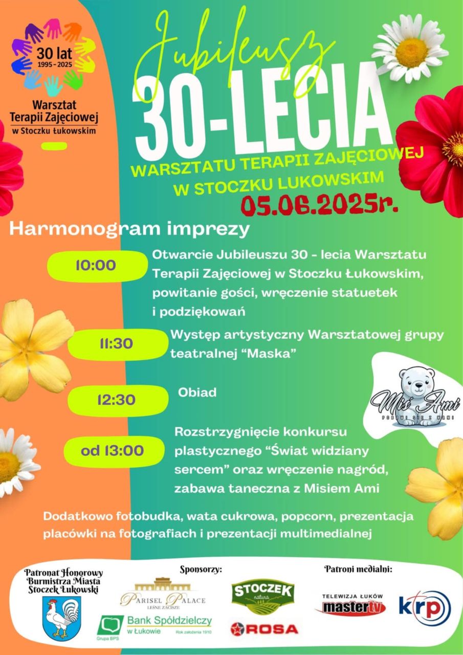 Mija właśnie 30 lat od chwili, gdy władze Stoczka Łukowskiego, we współpracy z Państwowym Funduszem Rehabilitacji Osób Niepełnosprawnych, zdecydowały o utworzeniu jednego z pierwszych w Polsce Warsztatów Terapii Zajęciowej. Z tej okazji już w czwartek, 5 czerwca, odbędą się jubileuszowe uroczystości. Miejscem świętowania będzie sala weselna w Starych Kobiałkach. Tam, o godzinie 10.00, spotkają się uczestnicy WTZ, ich bliscy oraz liczni zaproszeni goście.W programie wydarzenia zaplanowano m.in. wręczenie statuetek i podziękowań osobom zaangażowanym w działalność Warsztatu, występ warsztatowej grupy teatralnej „Maska” oraz rozstrzygnięcie konkursu plastycznego pt. „Świat widziany sercem”.