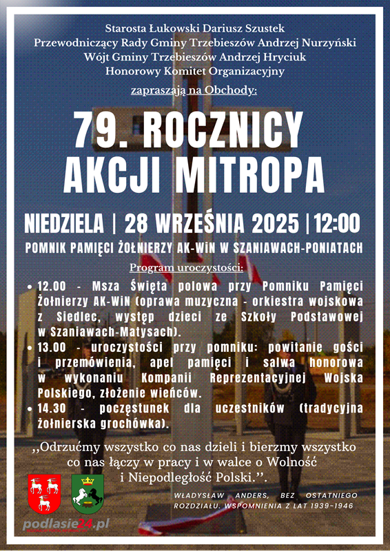 W niedzielę, 28 września, w Szaniawach-Poniatach odbędą się uroczystości upamiętniające 79. rocznicę Akcji Mitropa. Rozpoczną się w samo południe Mszą świętą polową przy pomniku Pamięci Żołnierzy AK-WiN.– Uroczystości odbędą się z udziałem Kompanii Reprezentacyjnej Wojska Polskiego Czwartego Skrzydła z Dęblina oraz orkiestry wojskowej z Siedlec – mówi Andrzej Nurzyński, Przewodniczący Rady Gminy Trzebieszów.