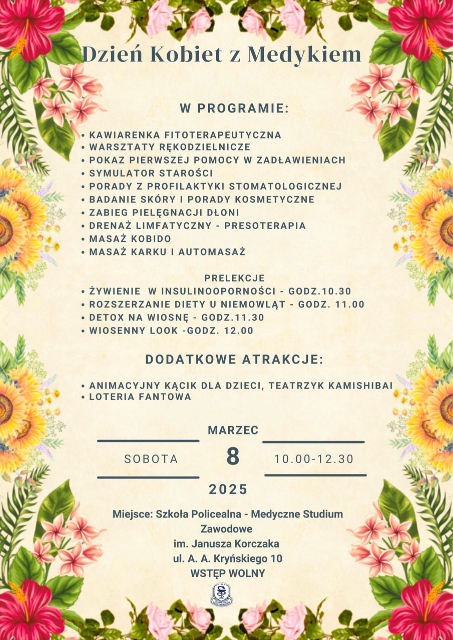 Z okazji Dnia Kobiet Szkoła Policealna - Medyczne Studium Zawodowe im. Janusza Korczaka w Łukowie organizują „Dzień Kobiet z Medykiem”. To wydarzenie odbędzie się w sobotę, 8 marca w siedzibie szkoły. Spotkanie dla pań (i nie tylko), rozpocznie się o godzinie 10.00 i potrwa do godziny 12.30. W tym czasie będzie można skorzystać z różnorodnych porad oraz obejrzeć specjalnie na ten dzień przygotowane pokazy i posłuchać prelekcji.W programie „Dnia Kobiet z Medykiem” znalazły się: kawiarenka fitoterapeutyczna, warsztaty rękodzielnicze, pokaz pierwszej pomocy w zadławieniach, symulator starości, porady z profilaktyki stomatologicznej, badanie skóry i porady kosmetyczne, zabieg pielęgnacji dłoni, drenaż limfatyczny – presoterapia, masaż kobido oraz masaż karku i automasaż.