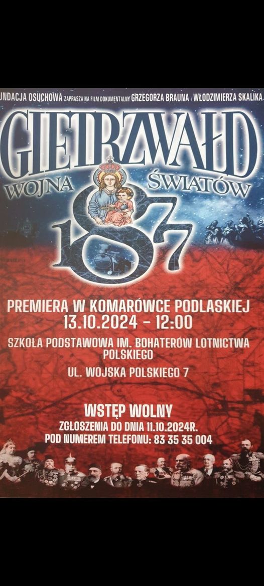 W niedzielę, 13 października w Komarówce Podlaskiej odbędzie się projekcja filmu "Gietrzwałd 1877 - Wojna światów" w reżyserii Grzegorza Brauna. Film zostanie wyświetlony w hali sportowej Szkoły Podstawowej w Komarówce Podlaskiej. Rozpocznie się o godzinie 12.00. Swoją obecnością spotkanie zaszczyci sam reżyser - Grzegorz Braun.