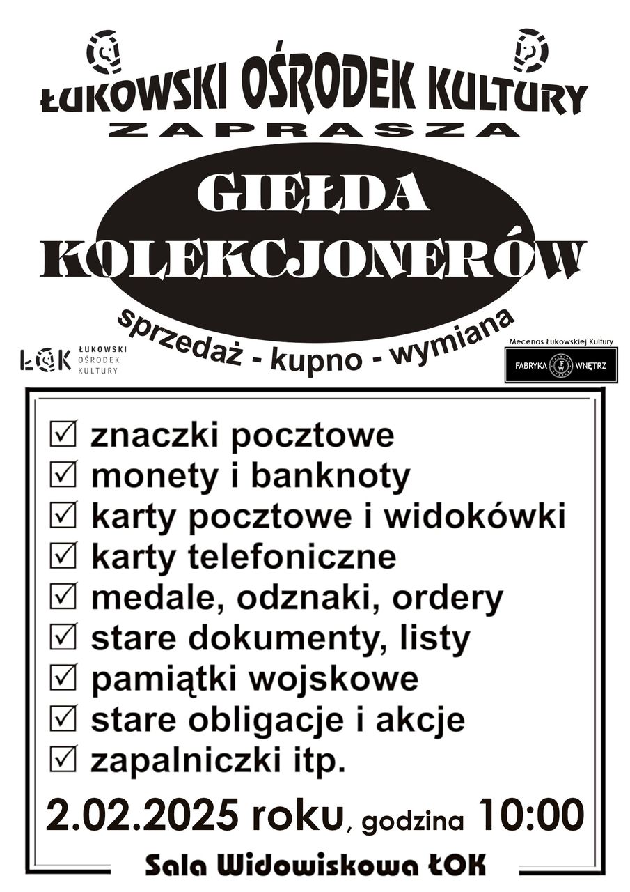 Przed nami pierwsza niedziela miesiąca, a to oznacza, że w Łukowskim Ośrodku Kultury odbędzie się Giełda Kolekcjonerów. Tradycyjne, comiesięczne spotkanie kolekcjonerów rozpocznie się o godzinie 10:00.