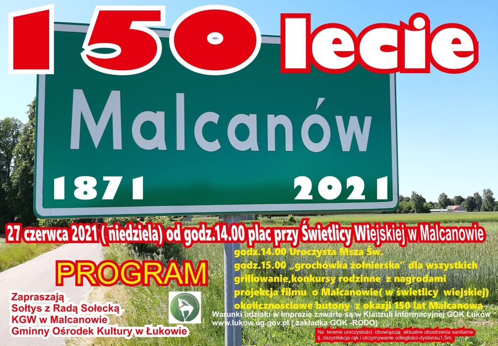 Jubileuszowe uroczystości rozpoczną się o godzinie 14.00 Mszą Świętą polową. Następnie na placu przy świetlicy odbędzie się festyn. Jednym z punktów programu będzie projekcja filmu o Malcanowie. Do wspólnego świętowania zapraszają Rada Sołecka i Koło Gospodyń Wiejskich w Malcanowie oraz Gminny Ośrodek Kultury w Łukowie.