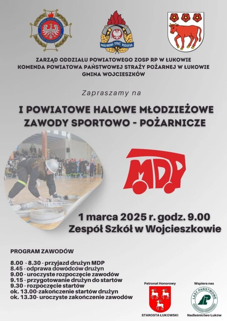 I Powiatowe Halowe Młodzieżowe Zawody Sportowo-Pożarnicze odbędą się w najbliższą sobotę, 1 marca. Młodzi druhowie spotkają się na hali w Zespole Szkół w Wojcieszkowie. Zawody organizują dla nich Zarząd Oddziału Powiatowego ZOSP RP w Łukowie, Komenda Powiatowa Państwowej Straży Pożarnej w Łukowie oraz gmina Wojcieszków. Honorowy patronat objął Dariusz Szustek, starosta łukowski.Zawody młodych druhów rozpoczną się o godzinie 9:00. Organizatorzy zapraszają do kibicowania.