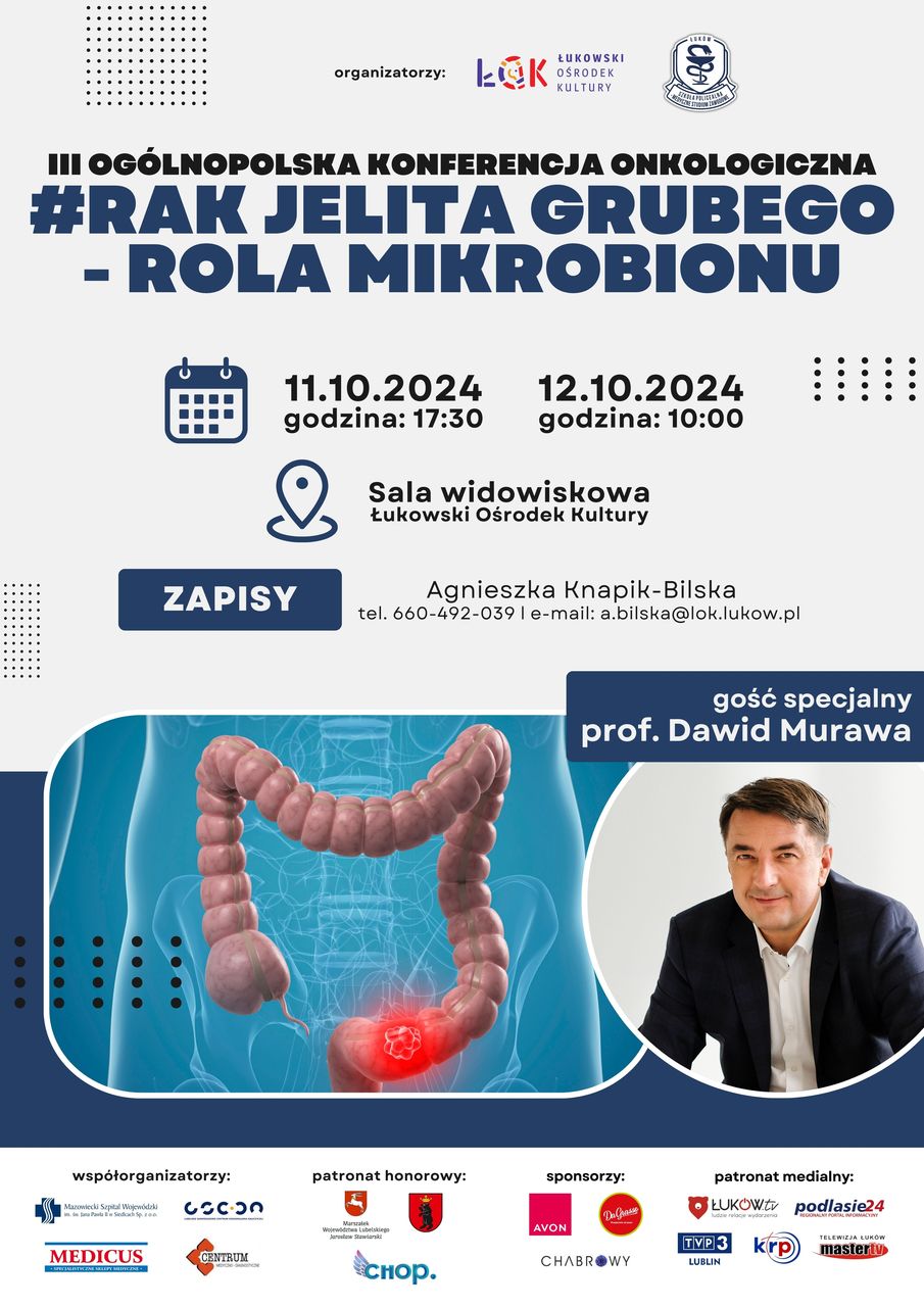 Organizatorzy III Ogólnopolskiej Konferencji Onkologicznej „#Rak jelita grubego - rola mikrobionu”: Łukowski Ośrodek Kultury i Szkoła Policealna - Medyczne Studium Zawodowe im. Janusza Korczaka w Łukowie. Współorganizatorzy: Siedleckie Centrum Onkologii, Lubelskie Samorządowe Centrum Doskonalenia Nauczycieli, Centrum Medyczno-Diagnostyczne Siedlce i Medicus.