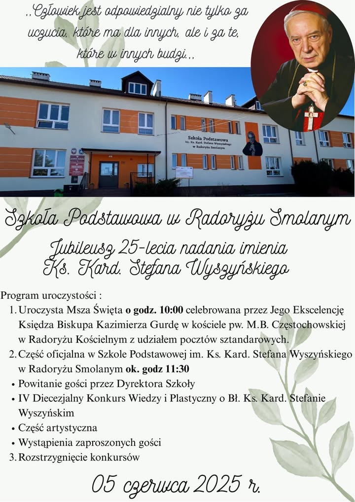 W tym roku mija ćwierć wieku od momentu, kiedy Szkole Podstawowej w Radoryżu Smolanym w gminie Krzywda nadane zostało imię księdza kardynała Stefana Wyszyńskiego. W rocznicę tamtego wydarzenia odbędzie się Msza Święta pod przewodnictwem księdza biskupa Kazimierza Gurdy oraz IV Diecezjalny Konkurs Wiedzy i Konkurs Plastyczny o kardynale.