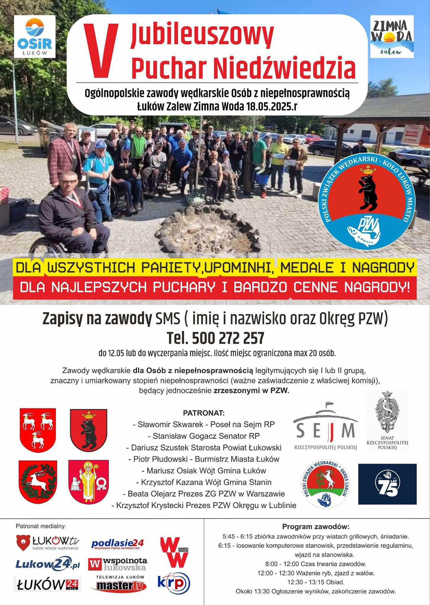 Jubileuszowy Puchar Niedźwiedzia odbędzie się w niedzielę, 18 maja, nad zalewem Zimna Woda. Zapisy już ruszyły i będą przyjmowane pod numerem telefonu 500 272 257. Rejestracja odbywa się poprzez wysłanie SMS-a z imieniem, nazwiskiem oraz Okręgiem PZW. Zapisy trwają do 15 maja, a liczba miejsc jest ograniczona.Program zawodów: