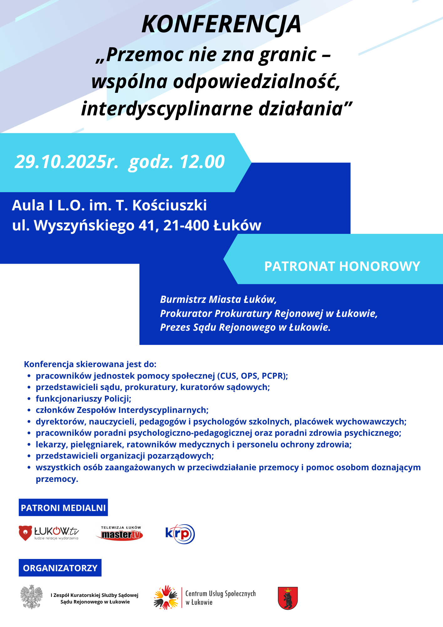 Konferencja odbędzie się pod honorowym patronatem Burmistrza Miasta Łuków, Prokuratora Prokuratury Rejonowej w Łukowie oraz Prezesa Sądu Rejonowego w Łukowie.