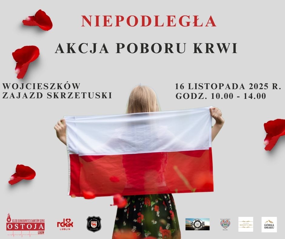 „Niepodległa – Akcja Poboru Krwi” odbędzie się w niedzielę 16 listopada w Wojcieszkowie. Tam pojawi się autokar Regionalnego Centrum Krwiodawstwa i Krwiolecznictwa. Zaparkuje przy Zajeździe Skrzetuski. Krew będzie można oddać w godzina od 10:00 do 14:00. Na tych, którzy po raz pierwszy zdecydują się oddać krew, będą czekały niespodzianki.Do podzielenia się bezcennym darem jakim jest krew zachęcają: HDK „Ostoja”, Regionalne Centrum Krwiodawstwa i Krwiolecznictwa w Lublinie, gmina Wojcieszków, Bractwo Motocyklowe 808, OSP Wojcieszków, Zajazd Skrzetuski, Górka Smaku oraz Koło Gospodyń Wiejskich z Wojcieszkowa.