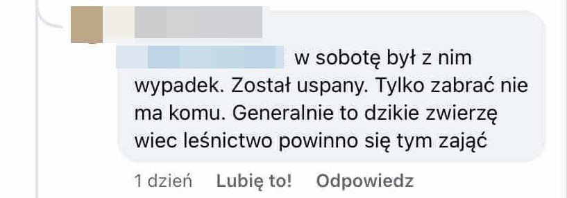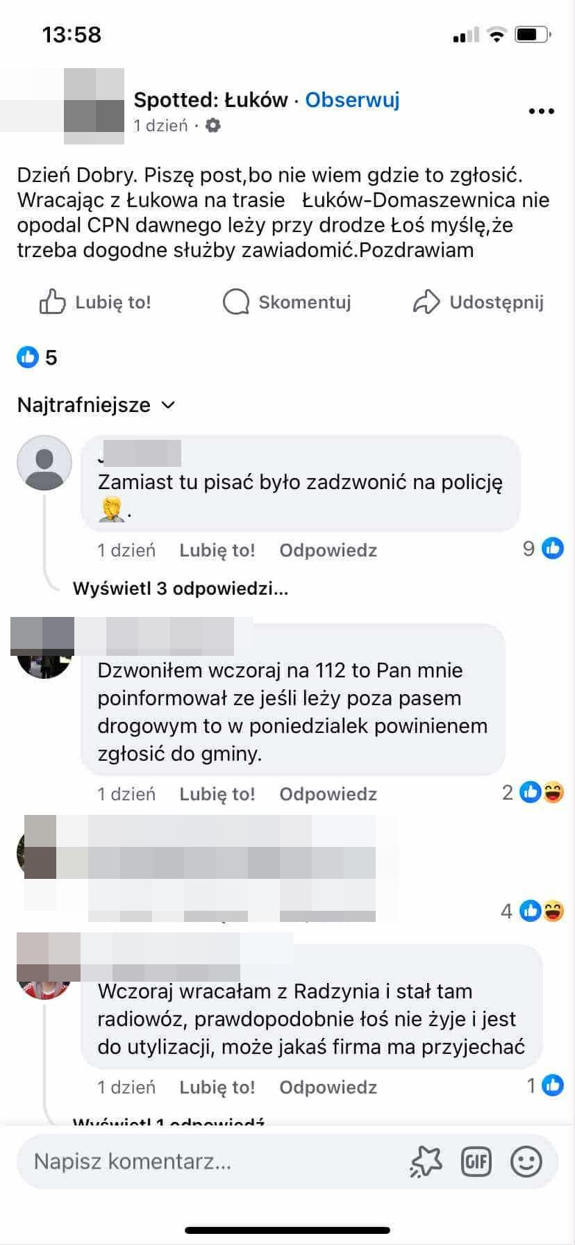 W przypadku wypadku z udziałem dzikiego zwierzęcia najlepiej natychmiast powiadomić policję. Funkcjonariusze powiadomią służby weterynaryjne i zajmą się czy to rannym, czy martwy zwierzęciem. W tym przypadku brak zgłoszenia na policję sprawił, że martwy łoś przez trzy dni leżał w pobliżu drogi.