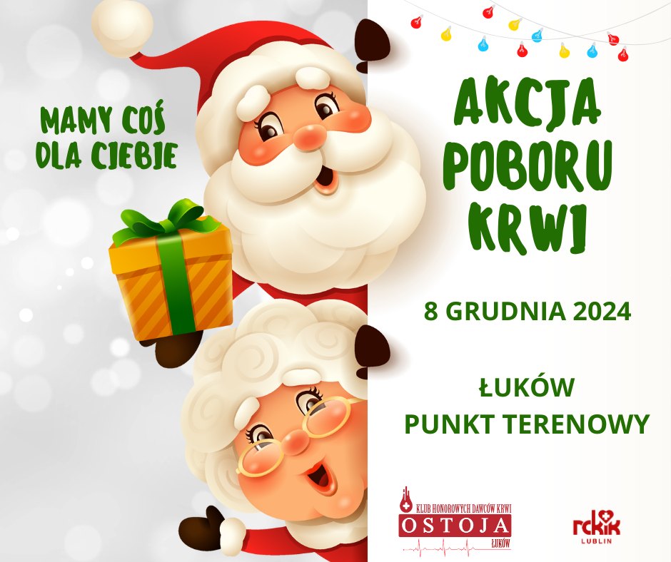 Dzień rozpocznie się on od Mikołajkowej akcji poboru krwi. Organizuje ją Klub Honorowych Dawców Krwi „Ostoja”. Każdy, kto zechce podzielić się tym bezcennym darem może liczyć na prezent od Mikołaja. Akcja będzie odbywała się w punkcie terenowym w Łukowie przy ul. Staropijarskiej 3. Potrwa od 10.00 do 14.00.https://lukow.podlasie24.pl/region/mikolajkowa-akcja-poboru-krwi-w-lukowie-kazdy-kto-odda-krew-dostanie-prezent-od-mikolaja-20241128112656