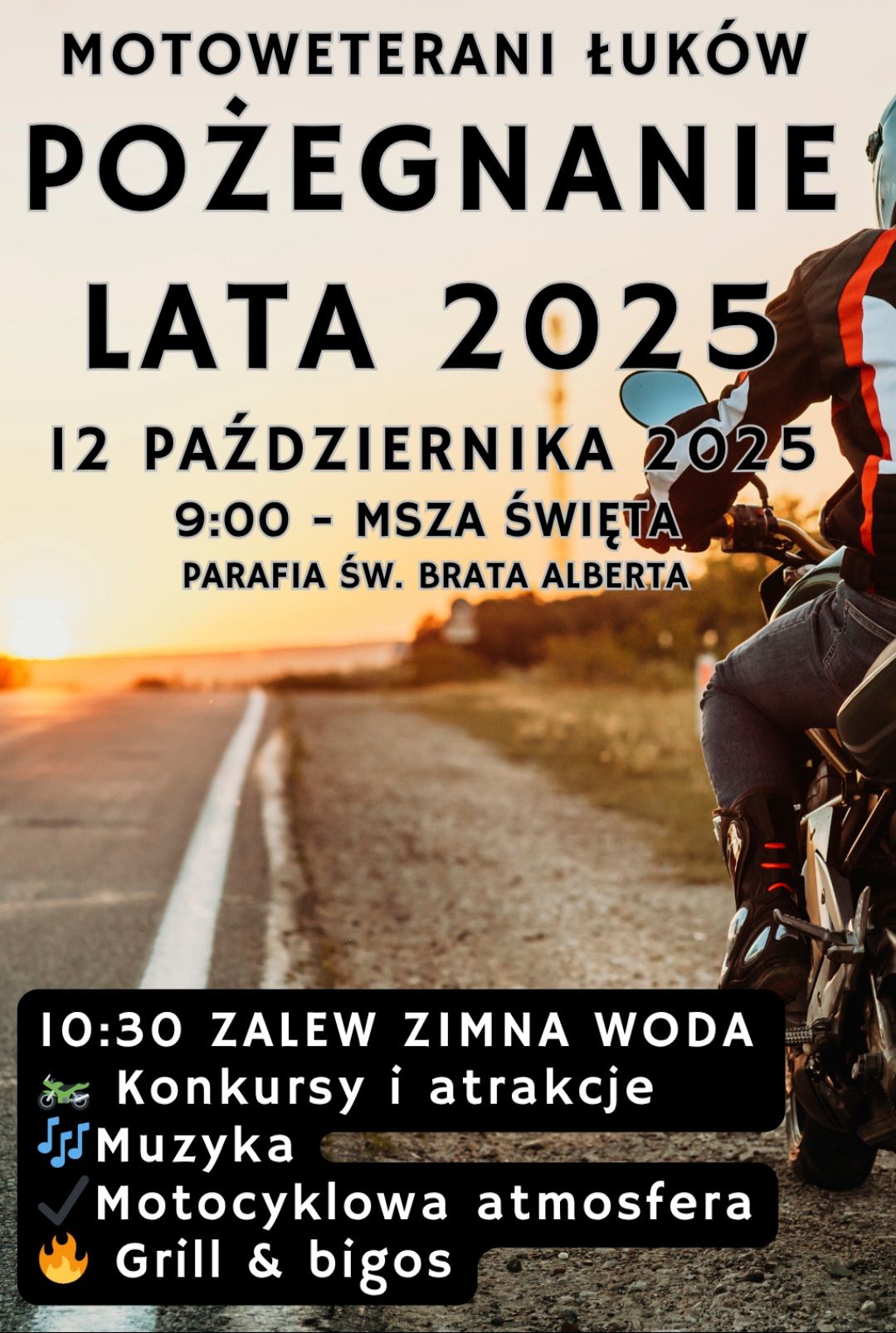 Zakończenie sezonu motocyklowego 2025 organizują Aiki Baiker FG z Radzynia Podlaskiego i Gray Bears. W wydarzeniu weźmie udział liczna ekipa Motoweteranów Łuków. O godzinie 9.00 motocykliści wezmą udział w Mszy Świętej, która odprawiona zostanie w Sanktuarium Matki Boskiej Nieustającej Pomocy w Radzyniu Podlaskim. Motocykliści będą dziękować za bezpieczny sezon i opiekę w drodze. Po wspólnej modlitwie wszyscy wyruszą na Motocyklową Pielgrzymkę na Jasną Górę, tworząc wspólny rajd.Celem wydarzenia jest zakończenie sezonu w duchowej atmosferze, podziękowanie za przejechane kilometry, przeżycia i wszystkie doświadczenia, które motocykliści zdobyli w mijającym sezonie, oraz wspólna podróż do Częstochowy – informują organizatorzy.