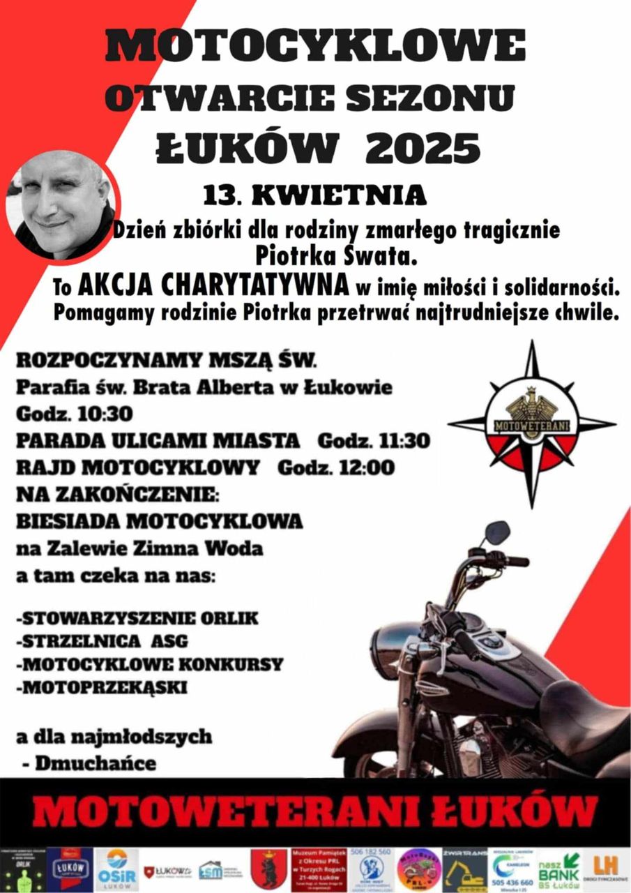 Otwarcie motocyklowego sezonu przez Motoweteranów Łuków rozpocznie się od Mszy Świętej o godzinie 10.30 w kościele Świętego Brata Alberta. Po wspólnej modlitwie motocykliści przejadą ulicami miasta. Następnie wybiorą się na przejażdżkę, a o godzinie 12.00 nad zalewem Zimna Woda rozpocznie się motocyklowa biesiada. Podczas pierwszego w tym sezonie pikniku prowadzony będzie kiermasz dla rodziny zmarłego tragicznie Piotra Swata.