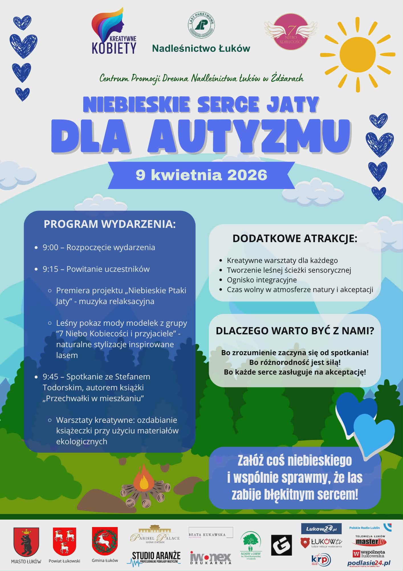 Nadleśnictwo Łuków, Kreatywne Kobiety oraz 7 Niebo Kobiecości ponownie zwierają szyki i organizują akcję wspierającą osoby ze spektrum autyzmu i ich rodziny. Odbędzie się ona 9 kwietnia w Centrum Promocji Drewna, które znajduje się na terenie wiaty edukacyjnej „Ostoja” w leśnictwie Jata w Żdżarach. Tego dnia będzie tam leśnie, niebiesko i absolutnie wyjątkowo.W programie m.in.: premiera projektu „Niebieskie ptaki Jaty”, premiera książki, warsztaty, spacery z leśnikiem oraz leśny pokaz mody. Początek spotkania godzina 9:00.