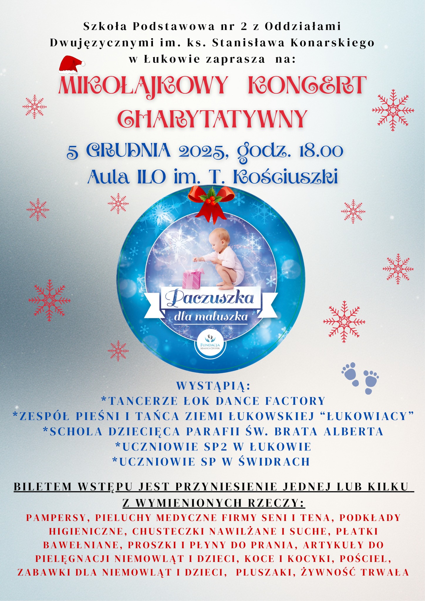 Mikołajkowy Koncert Charytatywny odbędzie się w auli I LO im. T. Kościuszki w Łukowie. Biletem wstępu będzie jeden lub kilku darów z listy potrzeb zgłoszonych przez placówki, dla których organizowana jest pomoc. Są to: pampersy, pieluchy medyczne firmy seni i tena, podkłady higieniczne, chusteczki nawilżane i suche, płatki bawełniane, proszki i płyny do prania, artykuły do pielęgnacji niemowląt i dzieci, koce i kocyki, pościel, zabawki dla niemowląt i dzieci, pluszami i trwała żywność.Akcja „Paczuszka dla maluszka” jest skierowana do podopiecznych Fundacji Małych Stópek. Finał akcji w Łukowie już w najbliższy piątek, 5 grudnia, o godzinie 18:00.