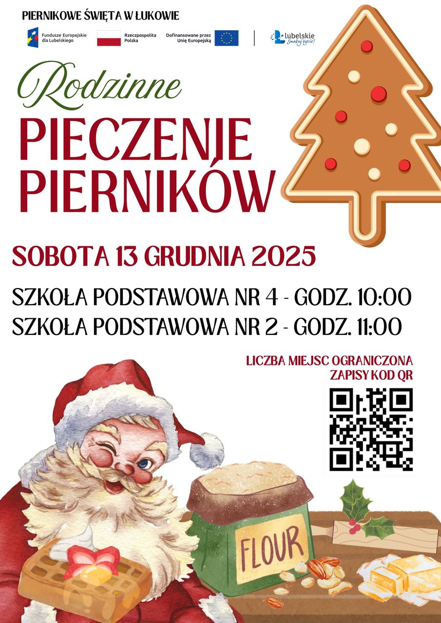 Organizatorzy informują, że liczba miejsc jest ograniczona, dlatego obowiązują wcześniejsze zapisy poprzez kod QR umieszczony na plakacie. Uczestnicy spotkań będą wspólnie przygotować i dekorować świąteczne pierniki. W Szkole Podstawowej nr 4 pieczenie rozpocznie się o godzinie 10:00, a w Szkole Podstawowej nr 2 – o godzinie 11:00.Rodzinne Pieczenie Pierników organizowane jest w ramach „Piernikowych Świąt w Łukowie” i jest współfinansowane ze środków europejskich.