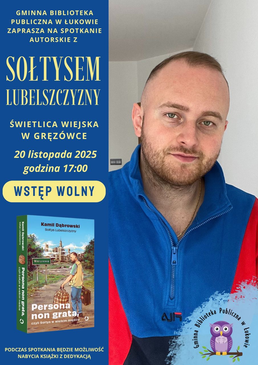 Kamil Dąbrowski pochodzi z Gołaszyna, w gminie Łuków. W mediach społecznościowych wszyscy znają go jako Sołtysa Lubelszczyzny. Każdy, kto chce go spotkać „na żywo” może wybrać się w czwartek 20 listopada do Gminnej Biblioteki Publicznej w Gręzówce. Spotkanie rozpocznie się o godzinie 17:00.Podczas pobytu w rodzinnych stronach Kamil Dąbrowski będzie opowiadał m.in. o swojej książce „Persona non grata, czyli Sołtys w wielkim mieście”.