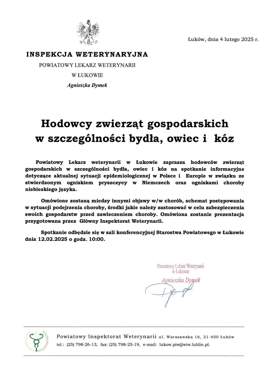 Powiatowy Lekarz Weterynarii w Łukowie organizuje spotkanie informacyjne dla hodowców zwierząt gospodarskich. Głównym tematem będzie aktualna sytuacja epidemiologiczna.