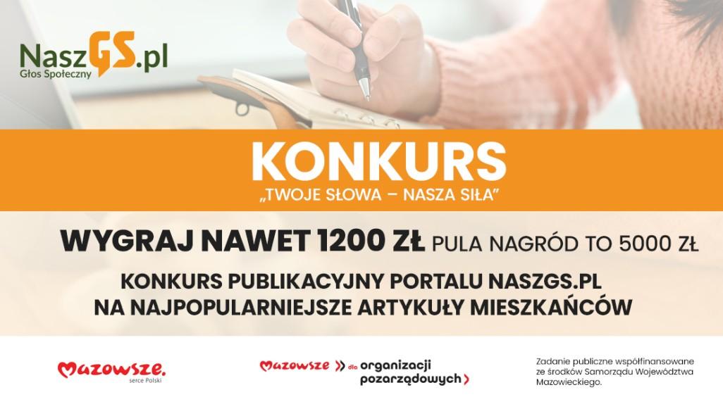 Konkurs autorski „Twoje Słowa – Nasza Siła” realizowany jest w ramach projektu NaszGS.pl – Nasz Głos Społeczny. Zadanie publiczne współfinansowane jest ze środków Samorządu Województwa Mazowieckiego.