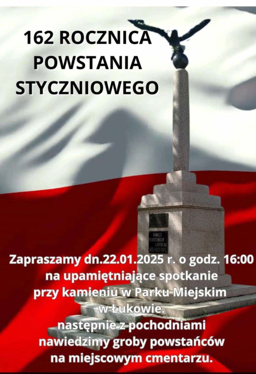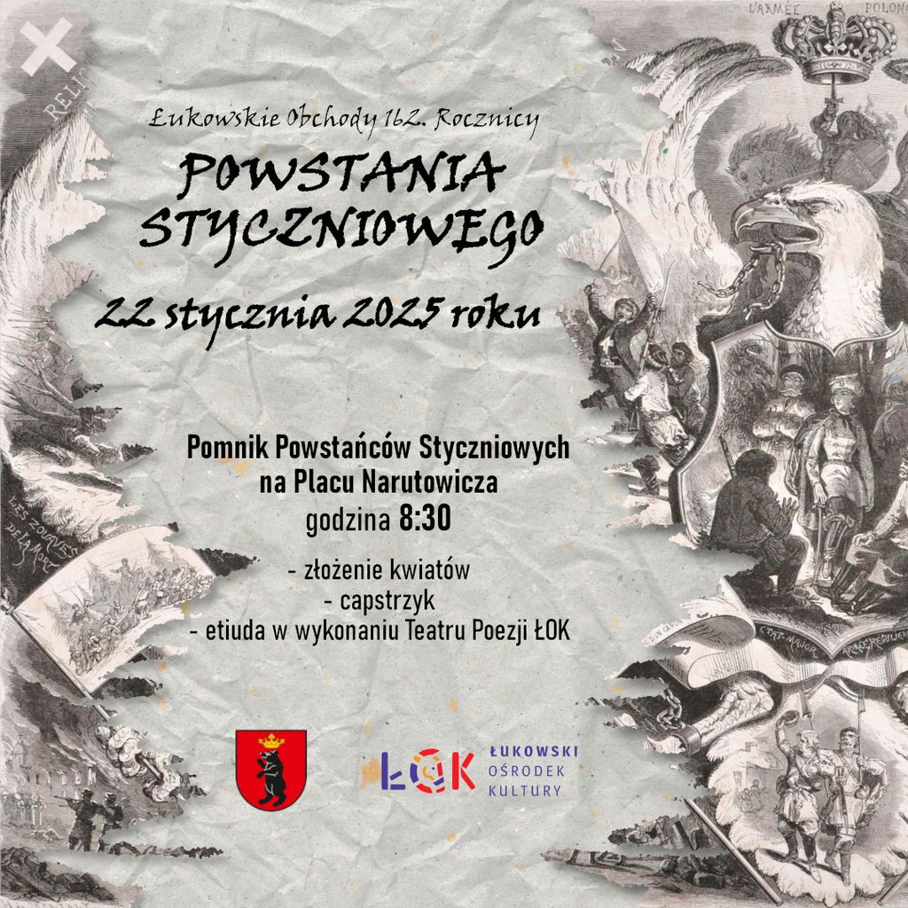 Łukowskie obchody 162. rocznicy wybuchu Powstania Styczniowego odbędą się 22 stycznia. Rozpoczną się o godzinie 8.30 przy pomniku Pamięci Powstańców Łukowian na Placu Narutowicza. Na tę część uroczystości zapraszają burmistrz Łukowa oraz Łukowski Ośrodek Kultury. W programie: etiuda pt. „Pójdziem, gdy zabrzmi złoty róg! Tak nam dopomóż Bóg!” w wykonaniu Teatru Poezji ŁOK, złożenie kwiatów oraz capstrzyk.