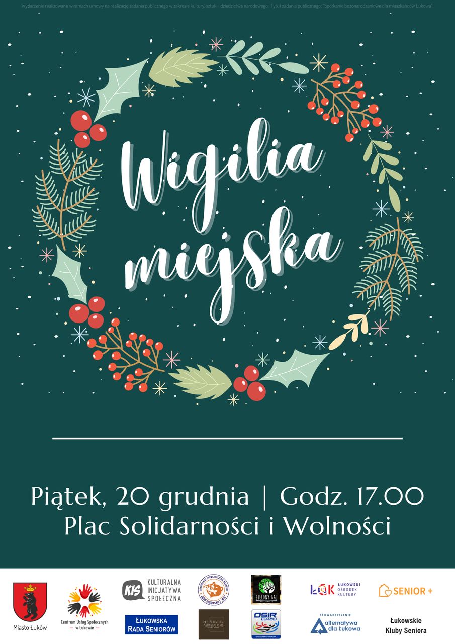 Podczas wigilijnego spotkania mieszkańcy będą mogli skosztować bożonarodzeniowych potraw przygotowanych przez Łukowską Radę Seniorów oraz działające na terenie miasta kluby seniora. O muzyczną oprawę zadbają członkowie Łukowskiej Orkiestry Dętej, Antonio Fartushny i Mariusz Gajda, a także łukowscy seniorzy. Nie zabraknie łamania się opłatkiem i świątecznych życzeń. Dodatkowo organizatorzy chcą pobić miejski rekord osób wspólnie śpiewających kolędy, który ustanowiony został w ubiegłym roku i wyniósł 320 osób.Miejskie spotkania wigilijne to kontynuacja tradycji zapoczątkowanej przez łukowskiego społecznika Andrzeja Zdrojewskiego. Tegoroczne wydarzenie zaplanowano na piątek 20 grudnia. Odbędzie się ono na Placu Solidarności i Wolności. Początek o godzinie 17.00.
