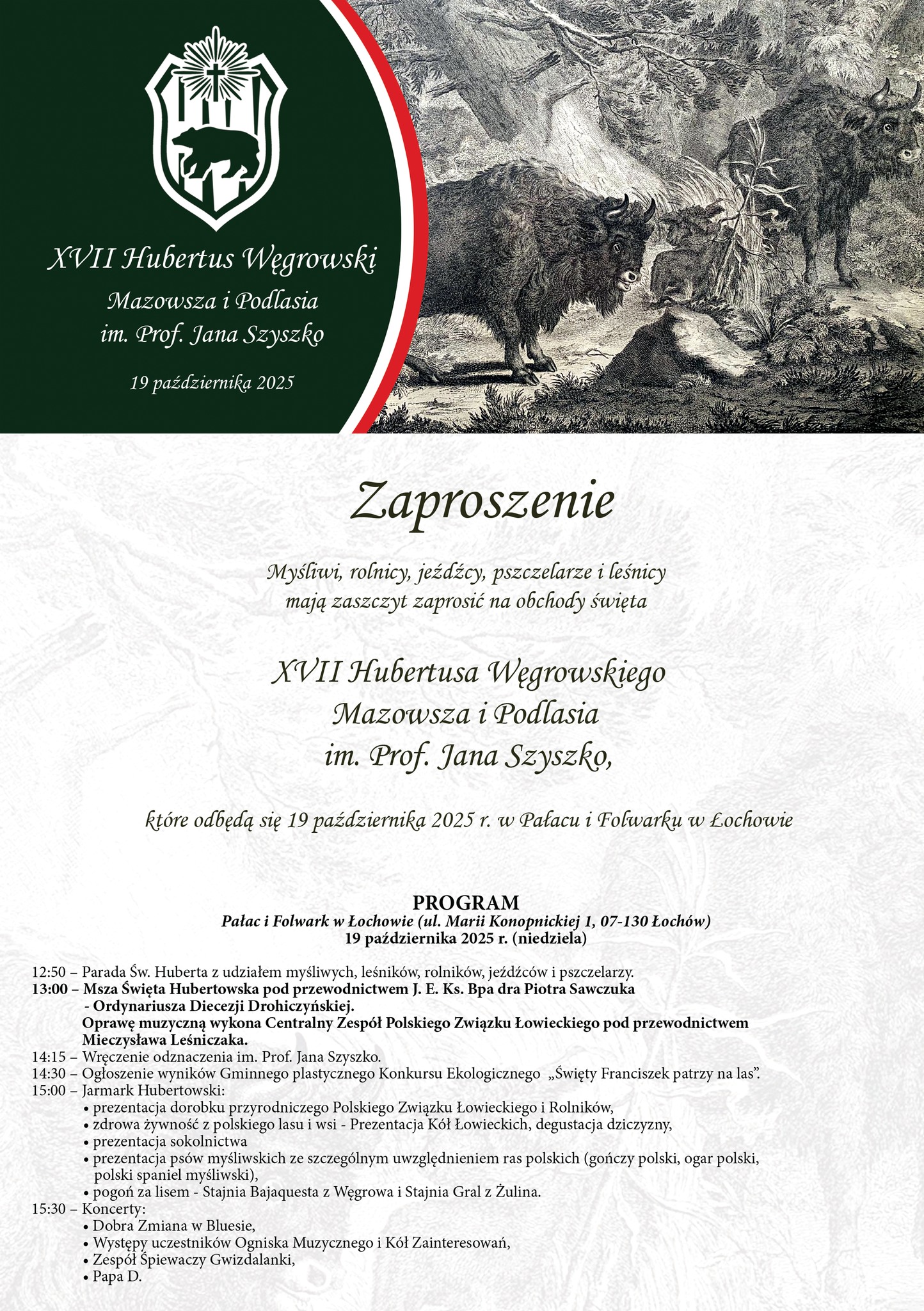 W Pałacu i Folwarku w Łochowie już po raz siedemnasty odbędzie się Hubertus Węgrowski Mazowsza i Podlasia im. prof. Jana Szyszko – tradycyjne święto myśliwych, leśników i jeźdźców. Hubertus organizowany jest na zakończenie sezonu łowieckiego, przypadające na przełom października i listopada. Uroczystości zaplanowano na niedzielę, 19 października.